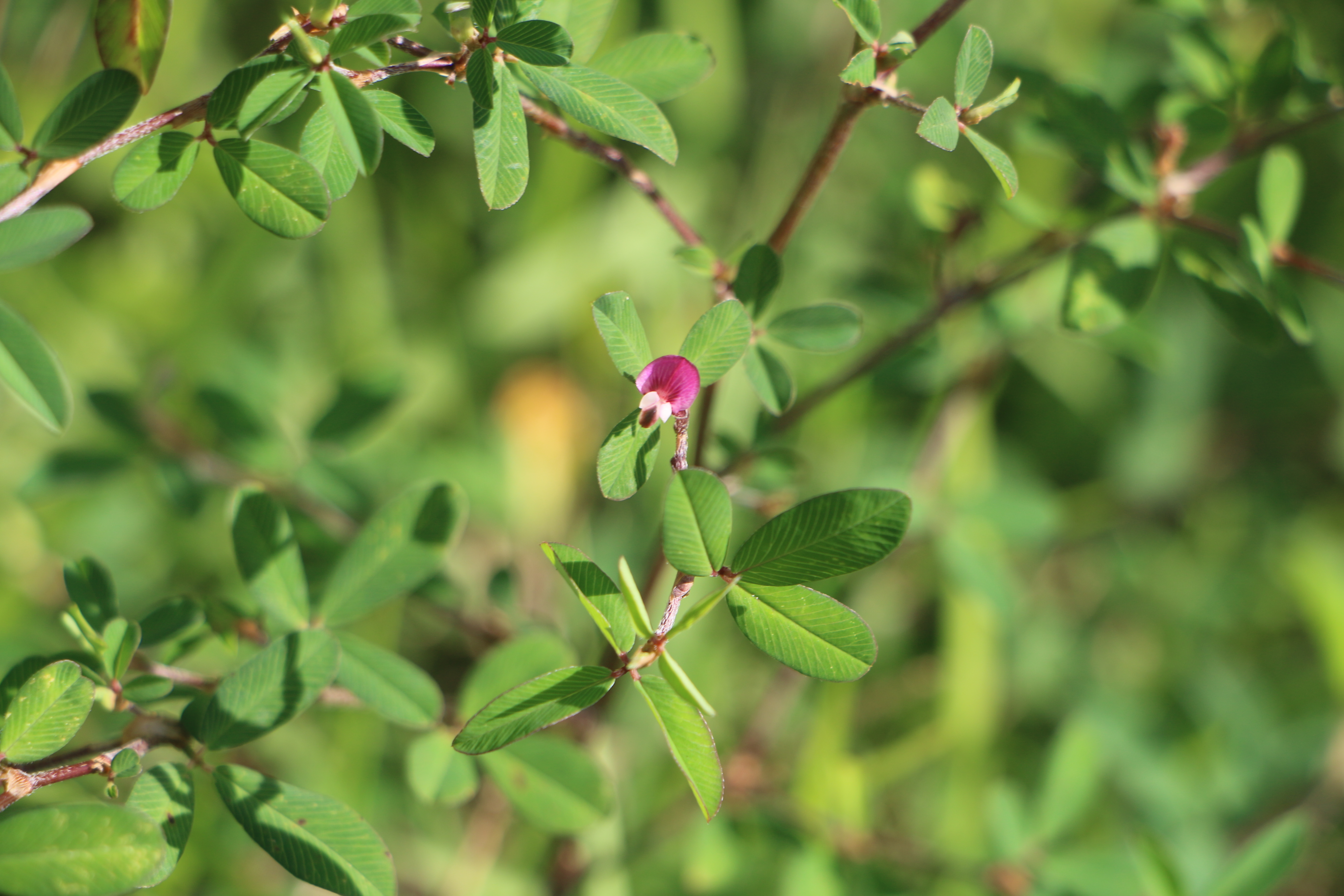 잎은 어긋나며, 3출엽으로 3개의 작은 잎이 모여 있습니다. 요즘 꽃이 핀 것을 볼 수 있는데, 꽃은 연한 붉은색으로 8∼9월에 잎겨드랑이에 1∼6개가 모여 핍니다. 길이 약 5mm정도여서 자세히 관찰하지 않으면 그냥 지나치기 쉽습니다. ^^