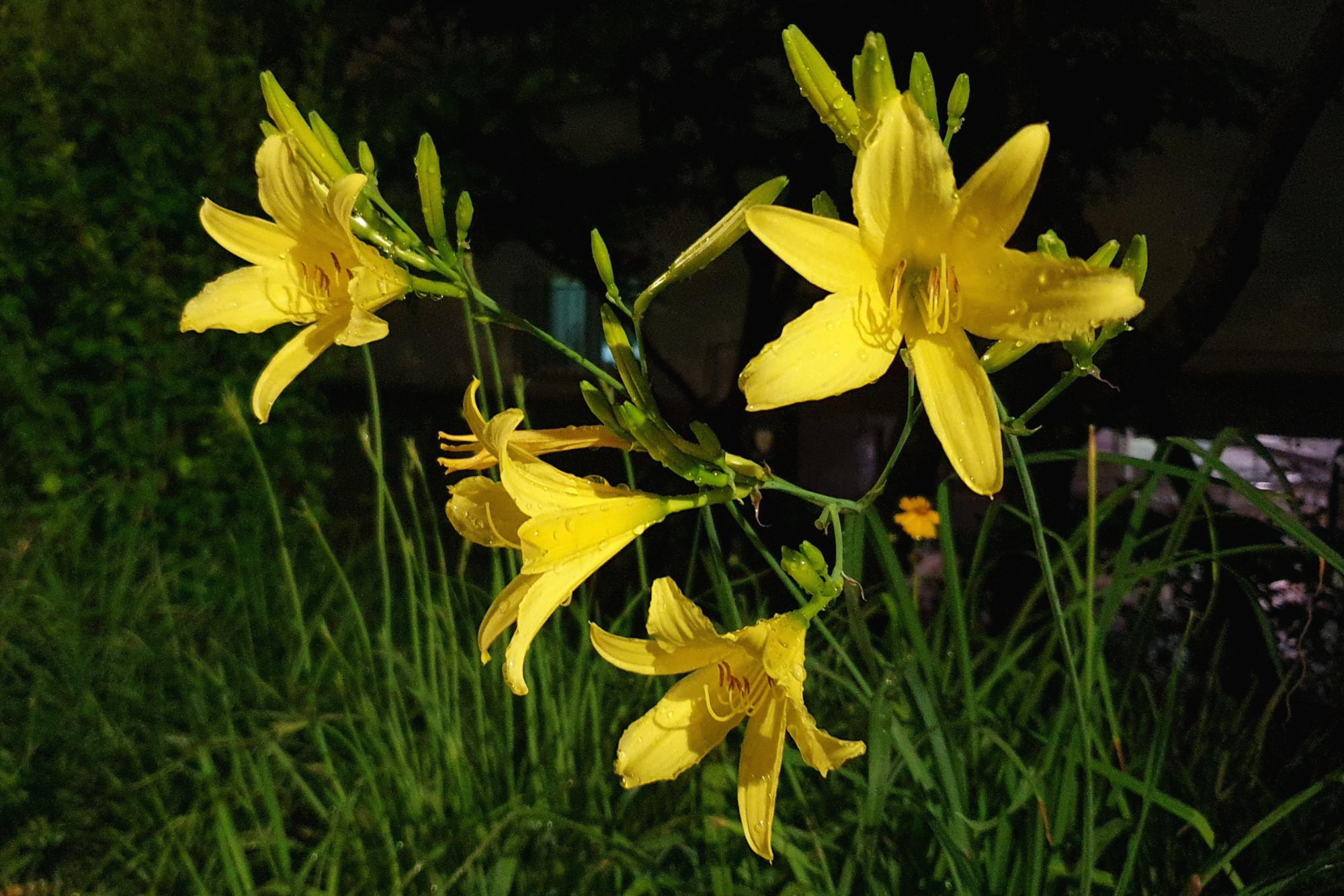 한밤에 경의선숲길을 산책하는데 앞에서 연한 노란색 원추리가 천천히 흔들렸다. 밤에 피는 노랑원추리<아래 사진>였다. 마치 ‘나를 안 보고 그냥 지나갈 수는 없을걸’이라고 말하는 듯했다. 6개로 갈라진 꽃덮이를 있는 힘껏 벌린 것이 도발적이기까지 했다. 꽃줄기 아래쪽은 피고 위쪽은 아직 몽우리로 남아 있는, 가장 예쁠 때였다. ^^